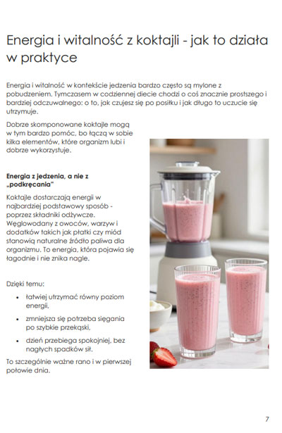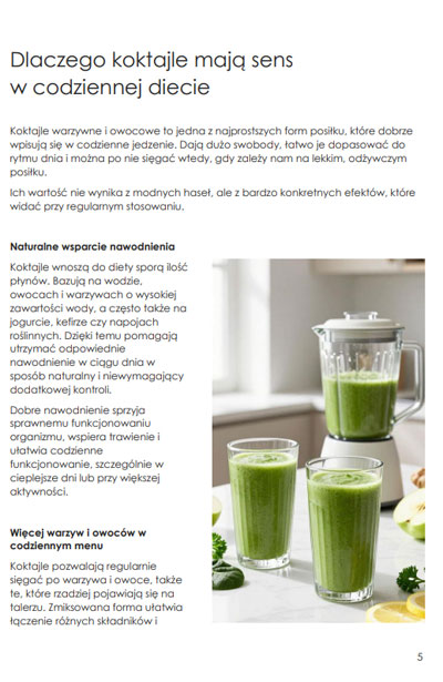 Znajdziesz w nim koktajle, które pomagają porządkować jedzenie w ciągu dnia, ułatwiają regularne sięganie po warzywa i owoce oraz dobrze wpisują się w spokojny rytm życia.