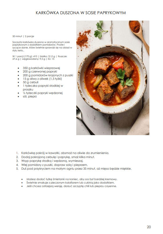 Wszystkie obiady mają niską ilość węglowodanów, a proporcje składników są dobrane tak, żeby sprzyjać stabilnej energii i długiemu uczuciu sytości. To keto, które da się normalnie gotować i jeść na co dzień.
