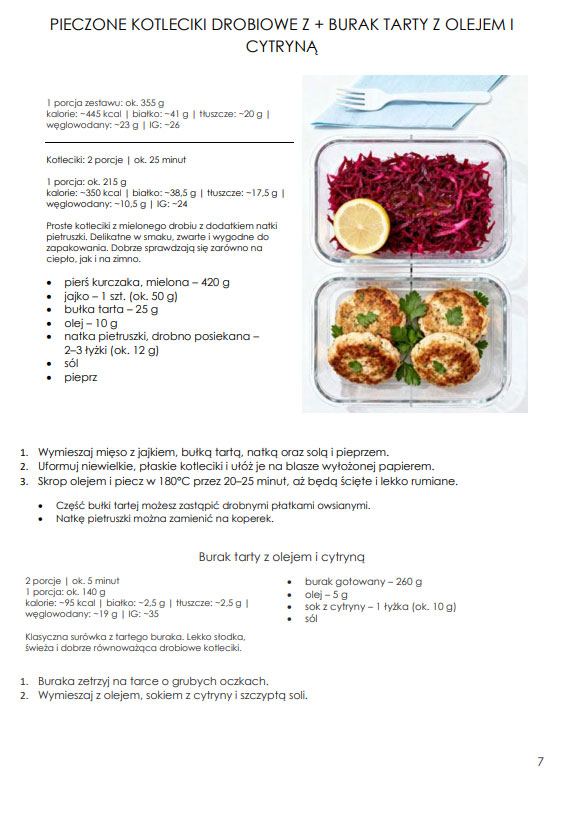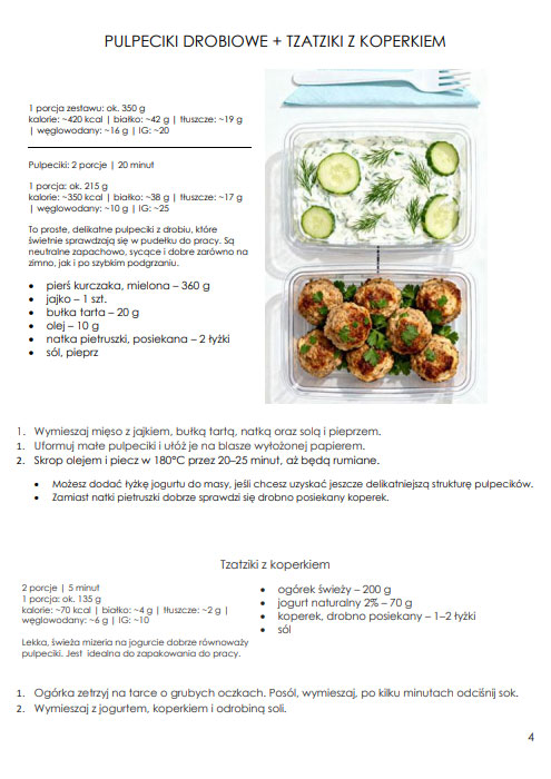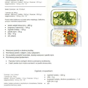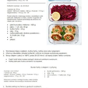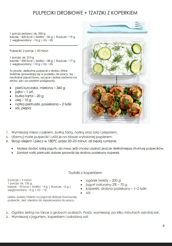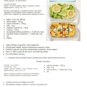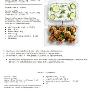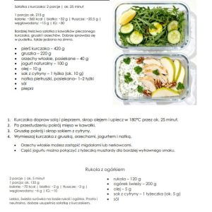 Pulpeciki drobiowe + tzatziki z koperkiem, Kurczak pieczony w jogurcie + surówka z marchewki i jabłka, Sałatka z pieczonego kurczaka i jabłka + surówka z sałaty rzymskiej, Pieczone kotleciki drobiowe z + burak tarty z olejem i cytryną, Kurczak pieczony z cytryną i ziołami + ogórek kiszony z olejem, Sałatka z kurczaka, gruszki i orzechów + rukola z ogórkiem, Pulpeciki drobiowe z pestkami dyni + kapusta pekińska z olejem i cytryną, Burger drobiowy ziołowy (bez bułki) + ogórek z rzodkiewką, Kurczak pieczony na zimno z natką + surówka z marchewki, Łosoś pieczony na zimno z koperkiem +sałatka z ogórków, Delikatne kotleciki rybne pieczone + surówka z pora blanszowanego, Sałatka z łososia, jogurtu i świeżych ziół + sałata lodowa, Pieczony filet rybny z cytryną + surówka z kapusty pekińskiej, Omlet na zimno z warzywami i ziołami + sałata rzymska, Serek wiejski z warzywami i pestkami dyni + surówka z ogórka z koperkiem, Jogurtowo-twarogowa miska białkowa + surówka z buraczków, Zapiekanka jajeczna z warzywami + surówka z kapusty pekińskiej, Kotleciki z soczewicy i jogurtu + surówka z ogórka, Sałatka z soczewicy, twarogu i ziół + surówka z pomidora, Pasta twarogowo-orzechowa z ziołami + surówka z sałaty, Sałatka białkowa z tofu i pestkami dyni + surówka z marchewki, Sałatka białkowa z kurczakiem i jogurtem + surówka z buraka, Pieczone pulpeciki drobiowe z koperkiem + surówka z ogórka kiszonego, Sałatka z pieczonego kurczaka i pomarańczy + surówka z sałaty i ogórka, Burger drobiowy z ziołami + surówka z marchewki i jabłka, Klopsiki drobiowe z jogurtem + surówka z zielonej sałaty i pomidorków, Sałatka białkowa z indykiem i jajkiem + surówka z sałaty rzymskiej. Kotleciki twarogowo-jajeczne + surówka z sałaty lodowej, Sałatka z pieczonego kurczaka i gruszki + surówka z rukoli i pomidorków, Pulpeciki drobiowe musztardą + surówka z sałaty rzymskiej, Pasta jajeczno-twarogowa + surówka z zielonej sałaty Sałatka z kurczakiem i pestkami dyni + surówka z kapusty pekińskiej, Mini burgery drobiowe + surówka z kapusty pekińskiej