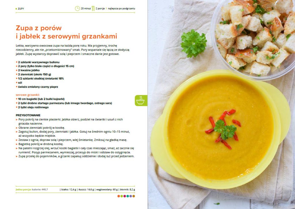 Krem z kalafiora z prażonymi pestkami dyni, Krem z cukinii z pesto z pełnoziarnistymi grzankami, Zupa porowo-gruszkowa, Zupa z porów i jabłek z serowymi grzankami, Zupa z soczewicy z chili i grzankami, Krem z batatów, Krem z pieczonych buraków, Zupa dyniowa, Zupa pomidorowa z bazylią, Zupa brokułowa, Zupa jarzynowa, Zupa grochowa z boczkiem, Chłodnik botwinkowy z fetą Zupa z kalafiora i ciecierzycy z ziołowymi grzankami, Zupa marchewkowa z batatem i chili, Zupa krem z kukurydzy, Aromatyczna zupa z dyni, Zdrowa zupa chińska, Zupa z ciecierzycy i ziemniaków, Zupa z cukinii, brokułu i szpinaku, Zielona zupa jarzynowa, Zupa krem z porów i szpinaku